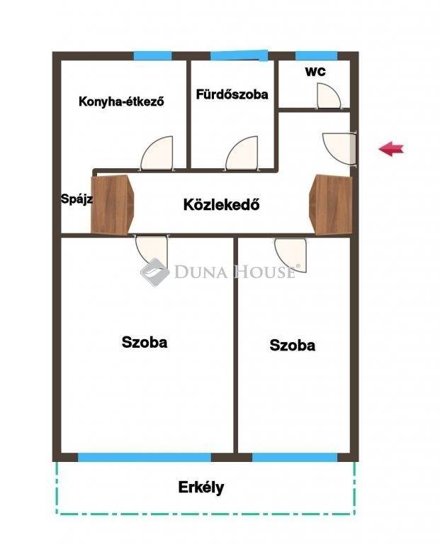 Elrendezése: előszoba, közlekedő, külön WC, fürdőszoba, két szoba, konyha és spájz.