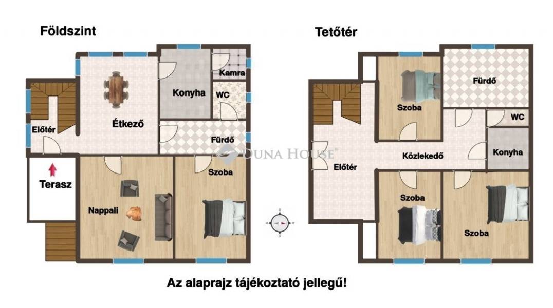 Az emeletre érve egy tágas előtér fogad, majd az innen nyíló folyosóról megközelíthető a nappali, két hálószoba, valamint a konyha, fürdőszoba és külön WC.