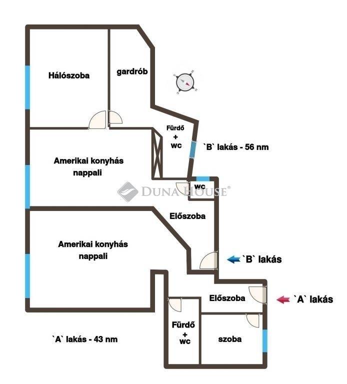 B lakás 56 nm és a lakás végleges kialakítása után egy amerikai konyhás nappali, egy nagy hálószoba melyből átjárás egy gardrób szobán keresztűl a fürdőszobába képet kapjuk melyíekhez még tartozik egy külön, vendég wc is az előszobában.