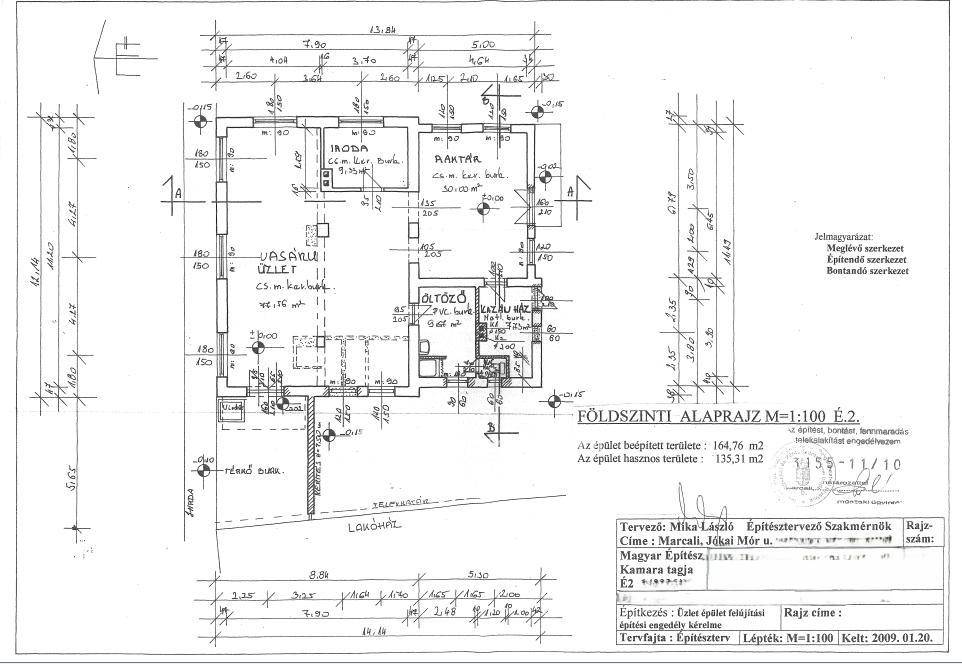 Az első épület egy 135 nm alapterületű bemutató terem/üzlethelyiség, amely akár lakhatásra is átalakítható. Itt láthatunk egy nagy egybenyitott teret, egy irodahelyiséget, egy mellékhelyiséget, egy konyhasarkot és egy kazánházat. A tér 2 részre oszlik, az egyik a bemutató terem a másik egy raktárhelyiségként szolgáló kisebb terem.