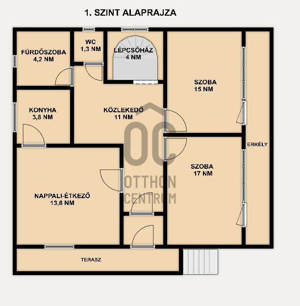 - 1. szint: 2 szoba, nappali-étkező, konyha, közlekedő, fürdőszoba, WC, lépcsőház, erkély összesen 70 nm hasznos alapterületű