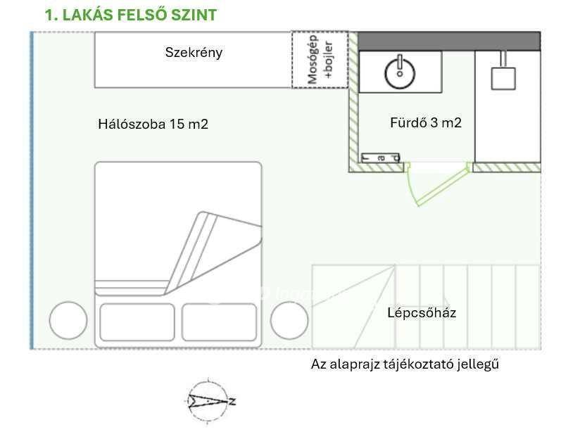 A földszinten amerikai konyhás nappali és WC az emeleten hálószoba valamint fürdőszoba található.