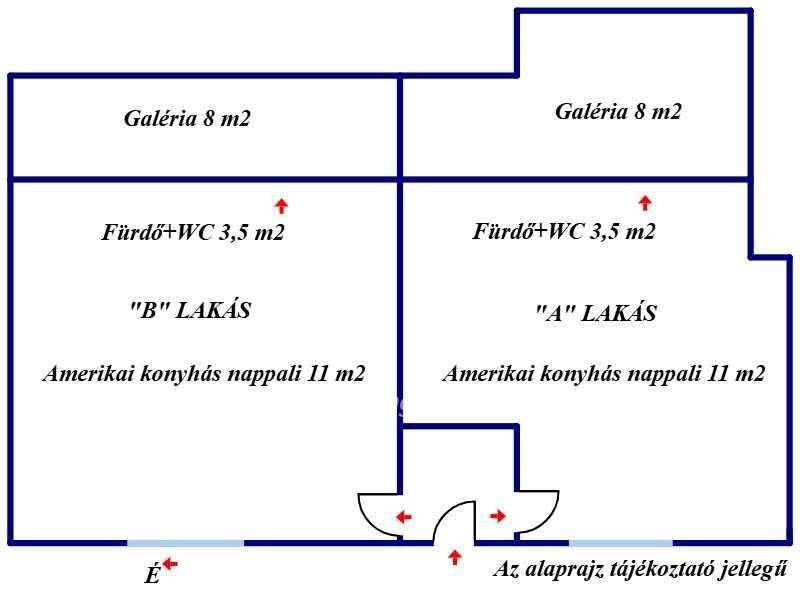 A baloldali lakás alsó szinten lévő alapterülete 14 m2, az üvegkorláttal ellátott galéria amely hálóként funkcionálhat 8 m2 , így került kiszámításra az össz hasznos alapterület 22 nm - nek.