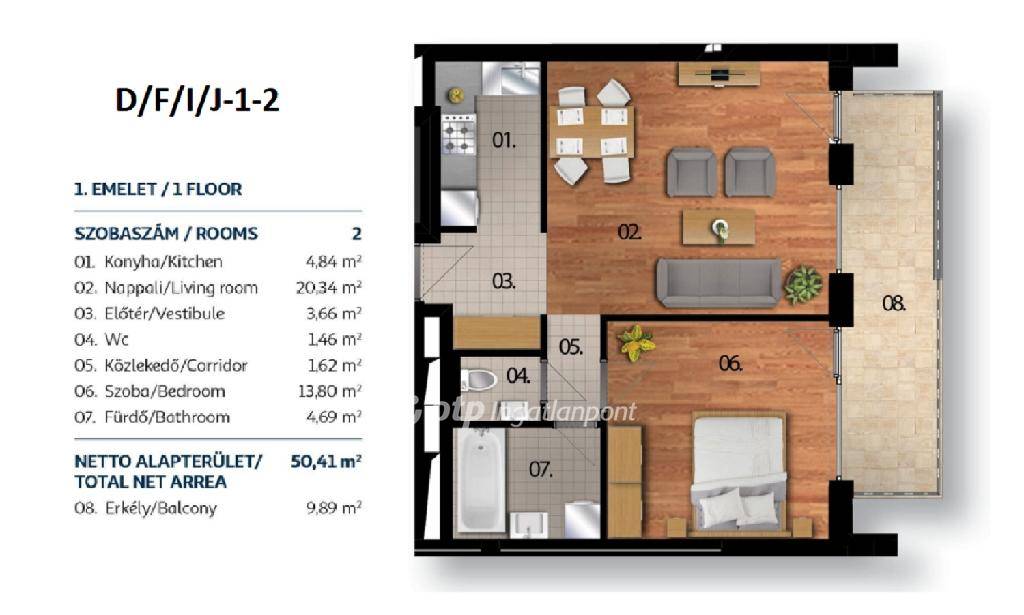 Lakások mérete: 43 nm-es, 1,5 szobás lakástól a 150 nm-es, 5 szobás és a tetőteraszos, exkluzív penthouseig.