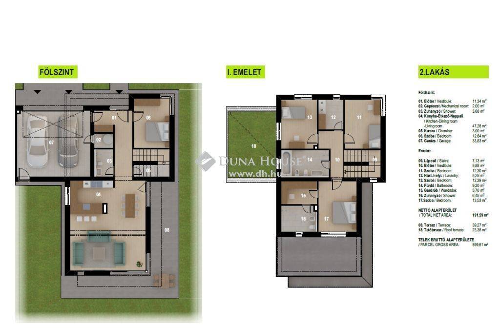 Válassza otthonának a Pallagon épülő ikerházainkat! Igényes lakókörnyezetben, csendes utcában, kiváló közlekedési feltételekkel, Debrecentől alig 2 km-re, a Nagyerdő közvetlen szomszédságában.Az új építésű ikerházak a garázsok mentén érintkeznek egymással. Mindkét ikerház alaprajza egyforma, belső kétszintes, nettó 191,5 nm-es alapterülettel rendelkező, nagy teraszos lakóingatlanok.A nettó 191,5 m2 alapterületen, a földszinti részen, hatalmas amerikai konyhás nappali kamrával, szobával, fürdővel, külön WC-vel, két autó beállására alkalmas garázzsal kerültek kialakításra.A közlekedőből vezet a lépcső a felső szintre. Itt három tágas hálószoba, két fürdőszoba, gardróbszoba és egy kisebb háztartási helyiség várja a beköltözőket.Az ingatlanhoz tartozó telkek 555 és 600 nm-esek, kizárólagos használati joggal.A lakóparkban lévő eladó ingatlanok egy esztétikus, biztonságos egységes kerítés rendszerrel lesznek körbevéve, ezzel is meghatározva az egységes építészeti és környezeti minőség színvonalát.Az ikerházi lakások megközelítése autóval gyors és egyszerű, akár a 4-es számú főút, akár a Pallagi úton Debrecen centrumából. Tömegközlekedési eszközökkel is könnyen elérhető, a 11-es helyi buszjárat megállója közvetlenül lakópark délkeleti határában található.Az új építésű lakópark legnagyobb értéke a természet közvetlen közelsége, amit a szomszédos Parkerdő, illetve a telkek laza szerkezetű beépíthetősége garantál. Az egyes telkek méretei, az helyi építési szabályzatban előírt kötelező nagy zöldterület, az alacsony beépítési százalék, mind az Ön intim, természet közeli élettérét biztosítja. A telkek nagy mérete miatt a területre, inkább nagyobb alapterületű épületek kívánkoznak. Eladó házak exkluzív, zárt lakóközösségünkben 32 család valósíthatja meg álmai otthonát.