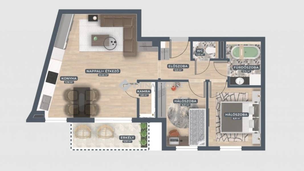 Ez a lakás az épület 3.-ik emeletén helyezkedik el, 60 nm, nappali + 2 szobával, 5 nm erkéllyel