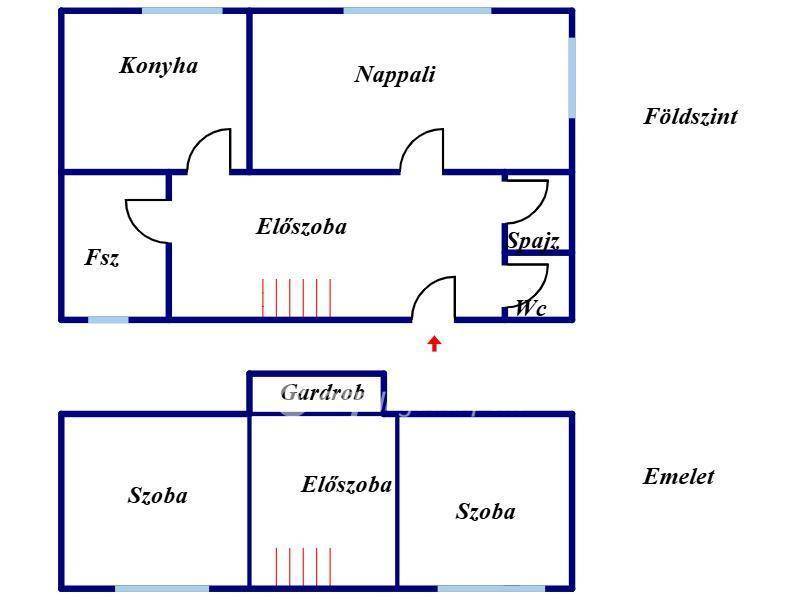 Az emelet két kényelmes hálószobából és egy gardróbból áll, amely akár második fürdőszobaként is kialakítható az új tulajdonos igényei szerint.