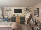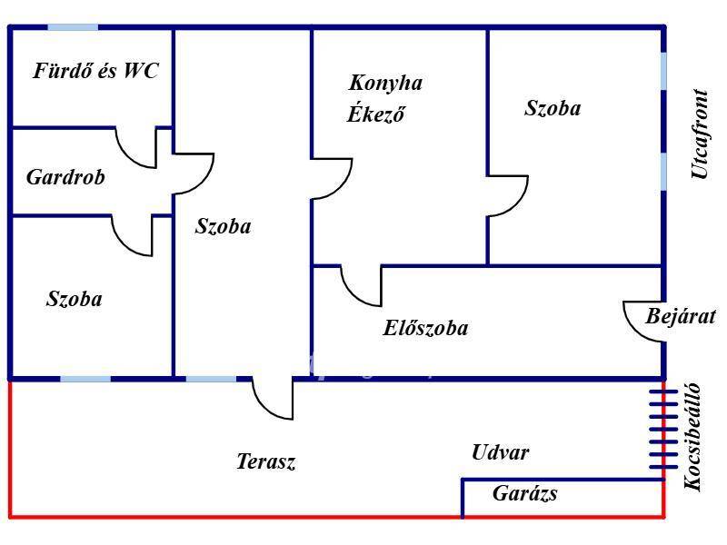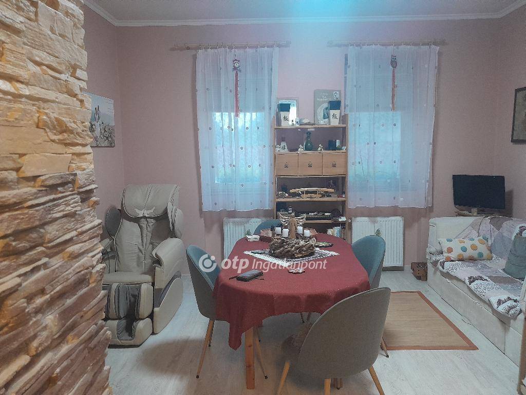 A bejárati ajtón belépve az előszobába jutunk, jobbra a konyhát étkezővel, onnan jobbra a hallt, balra pedig egy ízléses szobát találunk. Innen a fedett teraszra lehet kijutni, szemben tovább a gardrobszobát találjuk, ami szekrényekkel teljesen beépített, onnan jobbra a fürdő wc-vel helyezkedik el, balra pedig a háló található. A ház sehol sem vizesedik és beázás nyoma sem látható. Annyira száraz a levegő, hogy párásítani szokott a tulajdonos. Az ajtók ablakok hőszigeteltek és belátást gátló fóliaborítást kaptak, ami a nap ellen is sokat számít, de belső redőnnyel is ellátottak. A világításokat a tulajdonos ledesre cserélte. A vízteres kandalló és elektromosfűtés is automatizálva lett, ezért amikor a kandalló hőfoka lecsökken, automatikusan bekapcsol az elektromosfűtés, egyébként a gázcsonk telken belül van ez fűtés szempontjából plusz lehetőséget nyújt az új tulajdonosnak.