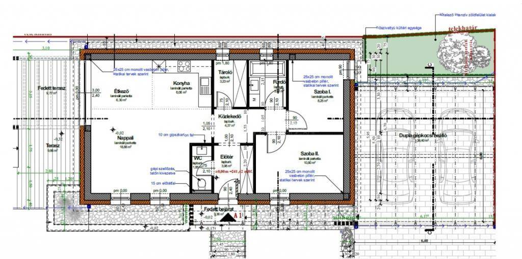 A hirdetésben szereplő A1 jelű első 441 m2-es telekrészen elhelyezkedő ikerház 67 m2-es, nappali, konyha, étkező, 2 szoba, tároló, külön WC, fürdő helyiségekkel rendelkezik, és két terasz egy fedett 9,77 m2-es, és egy 9,66 m2-es tartozik hozzá, ezen kívül egy dupla 38,40 m2-es gépkocsi beálló mely igény szerint garázzsá alakítható 12 Millió Forint értékben.