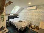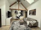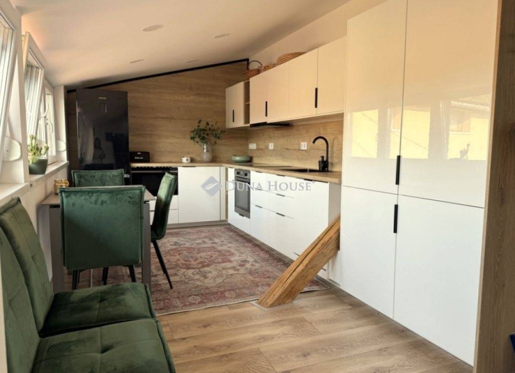 Az igényes konyha és étkező a modern eleganciát ötvözi a praktikummal, míg a látványos faldekorációk és a látható gerendák egyedülálló karaktert adnak a térnek.