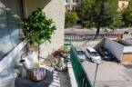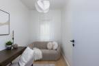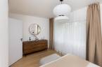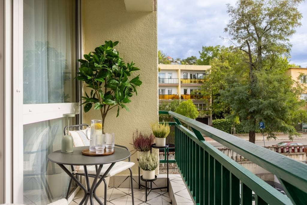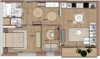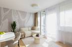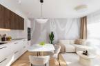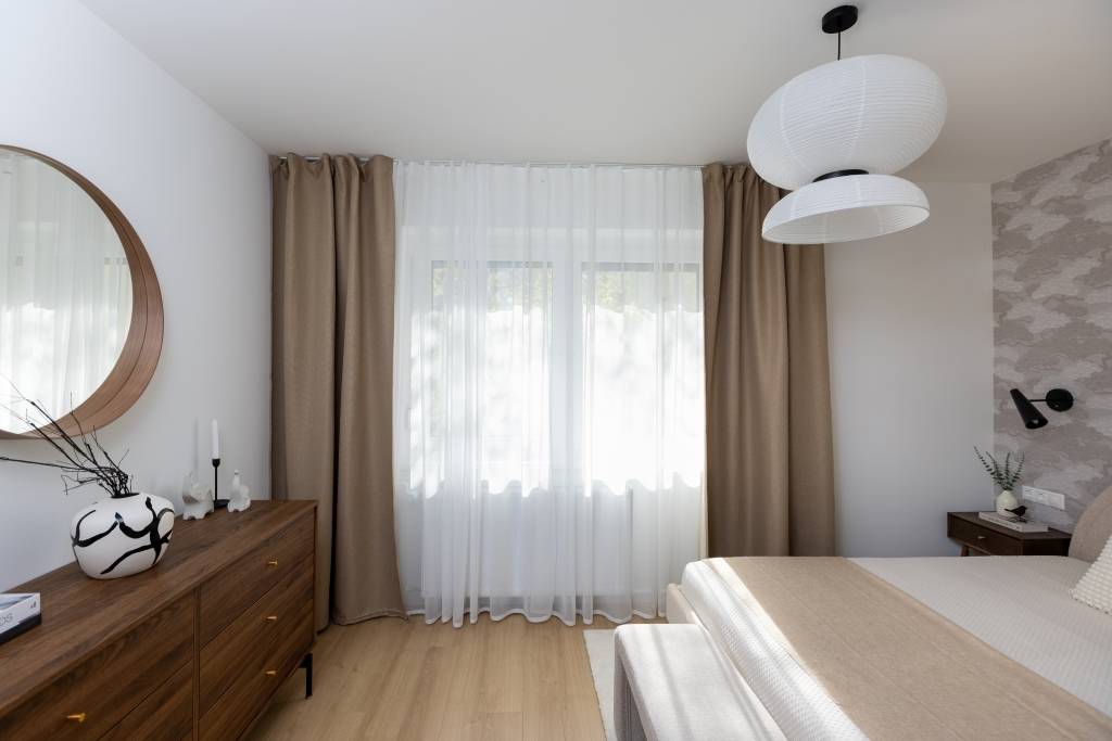 Az eredetileg egy hálószobás, konyha-étkezős lakást teljesen újragondolta a rutinnal és tapasztalattal rendelkező tervezőpáros: az épület és a korszak jellegét figyelembe véve, de a mai modern élet elvárásainak megfelelő tereket alkottak. Az így kialakult élettér tökéletesen megfelel életkezdő lakásnak, home office-ban dolgozóknak. A lakás helyiségei egy tágas központi térből, előtérből nyílnak. Itt nincsenek szűk, sötét közlekedőfolyosók, az egész tér átlátható, világos, nyugalmat sugároz. Egymás mellett találjuk a kézmosós wc-t és a kádas fürdőszobát. Modern, letisztult stílusú burkolatokat használtak, gondolva a funkcióra és az esztétikai élményre egyaránt. A fő hálószoba tágas, körbejárható benne a nagy méretű franciaágy, amivel szemben akár egész falat betakaró gardróbszekrénysor is elhelyezhető. A második hálószoba alkalmas dolgozószobának, gardróbnak, gyerekszobának, vagy egy kinyitható kanapéággyal akár vendégszobának is. A lakás központi tere és egyben leglenyűgözőbb látványt nyújtó helyisége az amerikai konyhás nappali, ahonnan kiléphetünk a loggiára és élvezhetjük a délelőtti nap sugarait. Itt minden éppen megfelelő méretű egy 2-3 fős család számára, a konyhabútor praktikus elrendezésű, teljesen gépesített. A konyha-nappali funkciókat az étkezőasztal különíti el, a nappaliban egy nagyobb, L alakú kanapé is elfér.