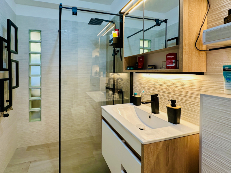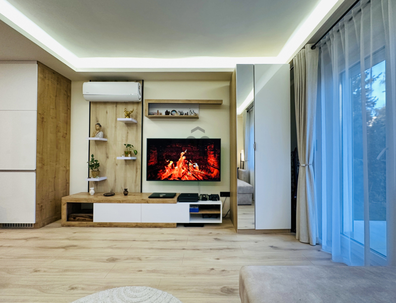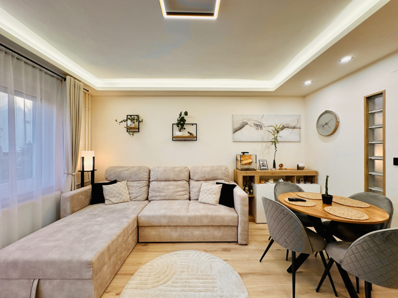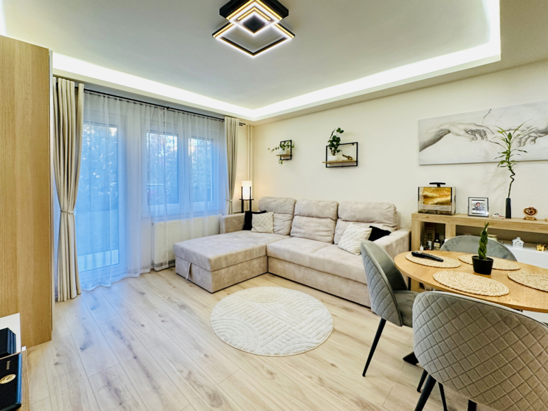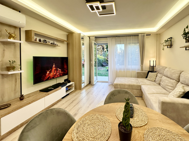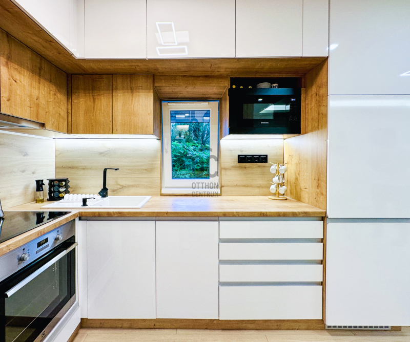 A lakás teljesen berendezve és gépesítve eladó – benne marad a kihúzható kanapéágy, étkezőasztal székekkel, beépített konyhabútor Electrolux gépekkel (indukciós főzőlap, sütő, hűtő, páraelszívó, mosogatógép), szekrények, valamint Midea hűtő-fűtő KLÍMA és ELEKTROMOS REDŐNYÖK is.