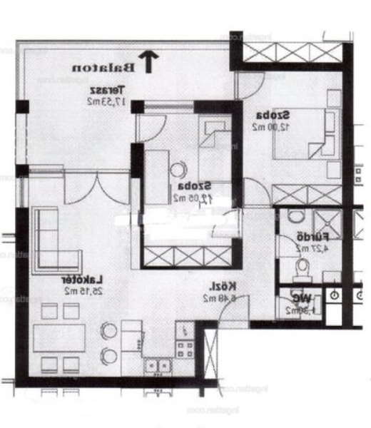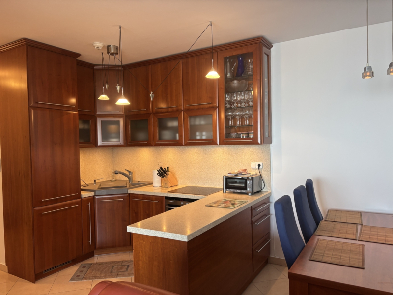 Az ingatlan nappali-amerikai konyhából, két hálószobából, fürdőszobából (hidromasszázs funkciós kád és zuhanyzó) és külön helységben lévő WC-ből, közlekedőből áll.