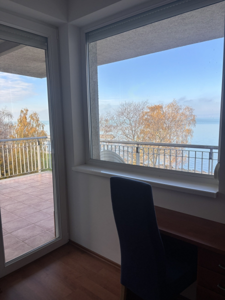 A 16 nm-es terasz fedett, örök panorámás a Balatonra.