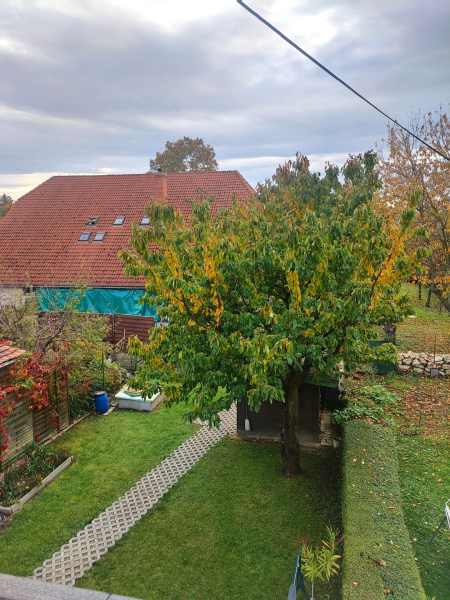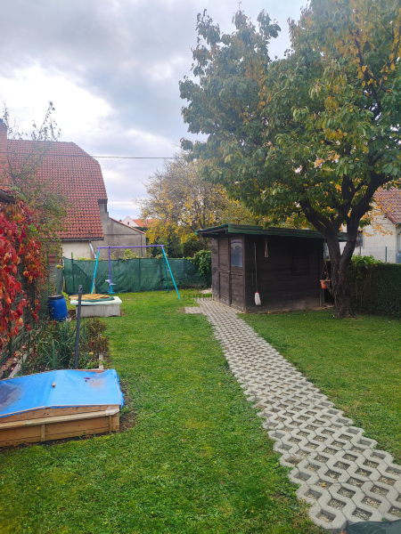 A 415 m²-es, gondozott telek üde zöld gyepével, virágszigeteivel és termő cseresznyefájával kifejezetten hívogató. A beton gyeprácsos autólejáró praktikusan simul a kertbe, miközben a házhoz érve az új homlokzat és a letisztult színek már első pillantásra a gondos felújításról árulkodnak.