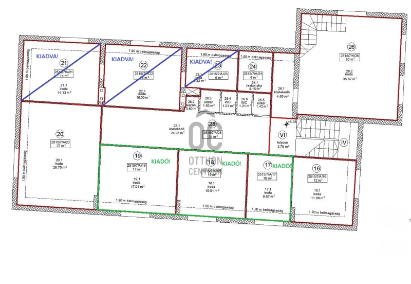 - A hirdetésben található iroda 42 m2 alapterületű, a szintrajzon a 17, 18, 19. számú együtt.