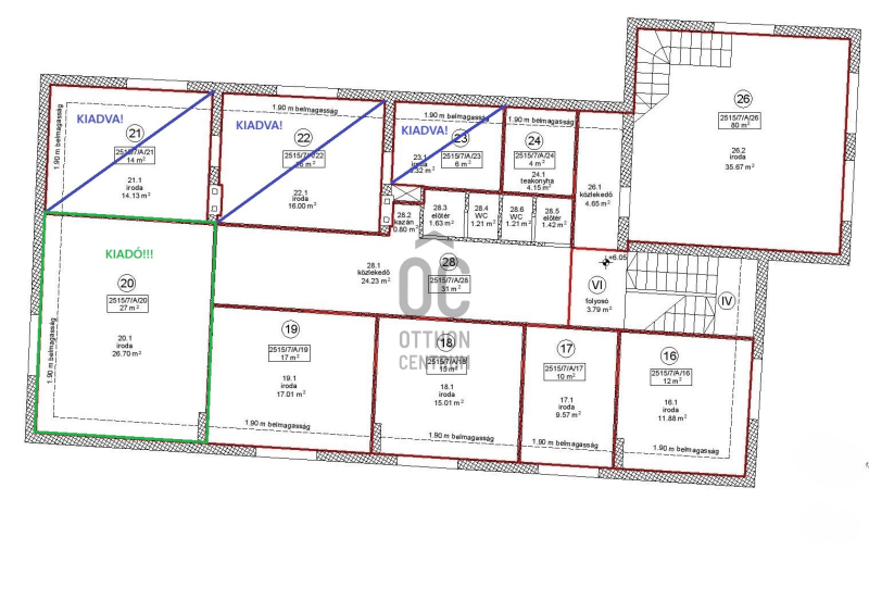 - A hirdetésben található iroda 27 m2 alapterületű, a szintrajzon a 20. számú.
