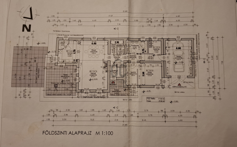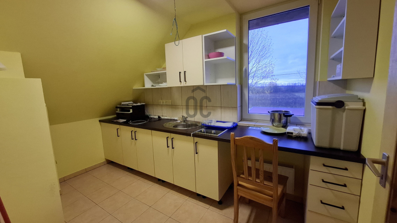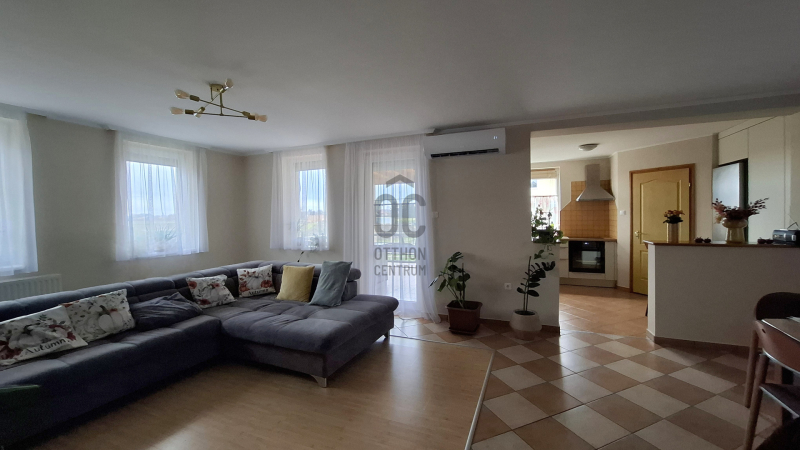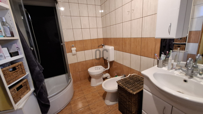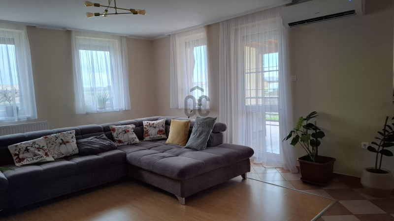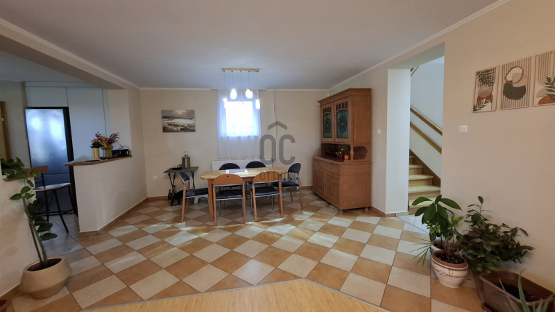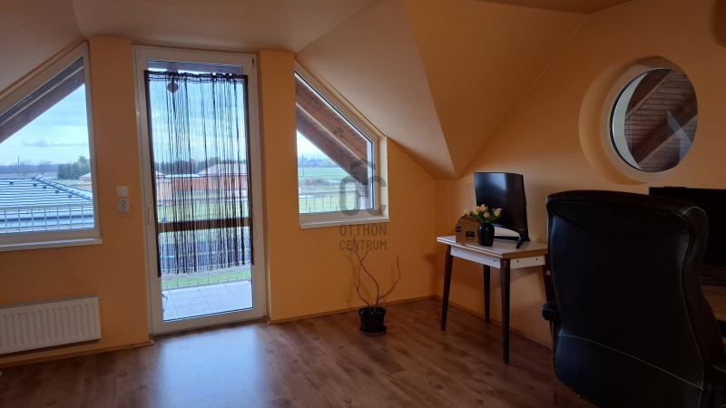Az ingatlan 173 m²-es alapterülete lehetővé tette a tágas, napfényes terek kialakítását, ahol mindenki megtalálhatja a maga helyét. A földszinten nagyméretű nappali-étkető található, a hozzá kapcsolódó konyhával különösen figyelemre méltó. Ezek a helyiségek nemcsak funkcionálisak, hanem a családi összejövetelek, baráti találkozók ideális színterei is lehetnek. A nappalihoz kapcsolódó teraszon a nyári estéken kellemesen pihenhet. Ezen a szinten még egy hálószoba; káddal, zuhanyzóval, Wc-vel felszerelt fürdőszoba; külön toalett kézmosóval áll a lakók rendelkezésére. Az épülethez kapcsolódik egy tágas helyiség, ami eredetileg gépkocsi tárolására terveztek, de jelenleg bármilyen funkcióra (akár vállalkozási célra is) használható, hisz a lakóingatlan mellet egy duplagarázs is megépítésre került.