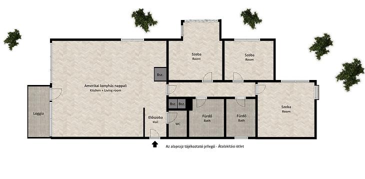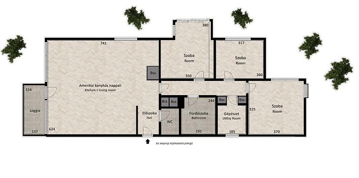 A lakás központi része a tágas, nagy üvegfelülettel rendelkező, dk-i fekvésű, erkélykapcsolatos, szép kilátással rendelkező amerikai konyhás nappali.
