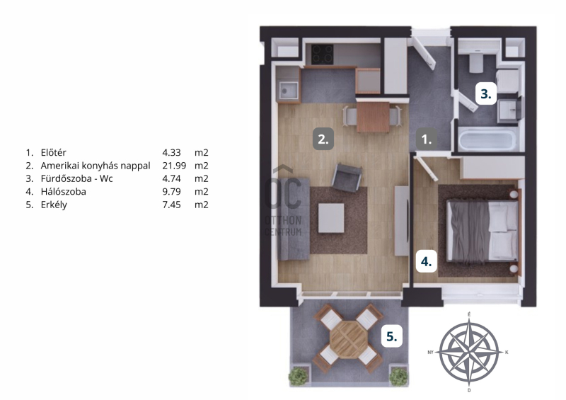 ✅ Felosztása: előszoba, erkély kapcsolatos amerikai konyhás nappali és étkező, hálószoba, fürdő-wc.