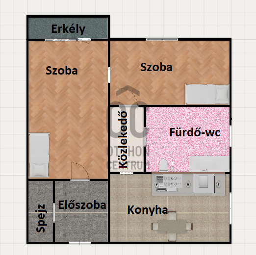 Az ingatlanban található két tágas szoba és egy fürdőszoba,konyha és egy spejz is amelyek kényelmesen elhelyezkednek, lehetővé teszik a nyugodt mindennapokat, míg az erkély, amely 5 négyzetméter nagyságú, remek helyszínt biztosít a reggeli kávézáshoz vagy a pihenéshez a friss levegőn.