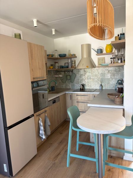 Modern, gépesített konyha,stílusos ,igényes burkolatok, bútorok , napfényes terek jellemzik a nyugati fekvés lakást.