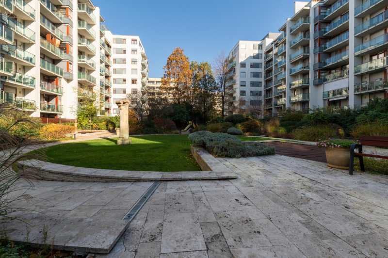 Gondozott, Belső Park: A házak által körbefogott területen egy különlegesen szépen ápolt, díjnyertes közös díszkert biztosítja a nyugodt pihenést, távol a város zajától.