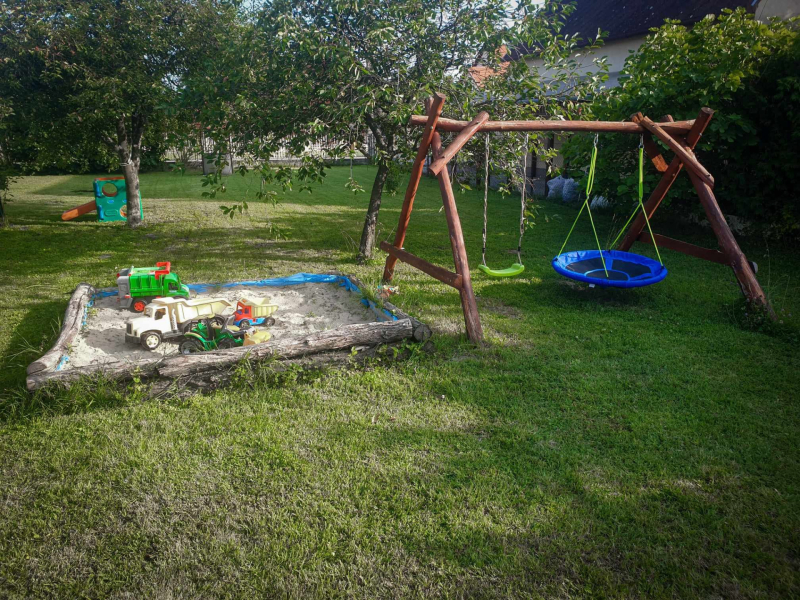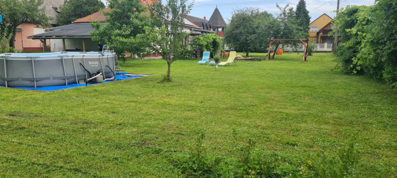 - füvesített udvar örökzöldekkel, gyümölcsfákkal beültetve