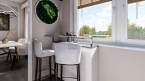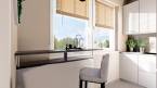 Csendes, világos: zöld parkra néző ablakok a konyhában és a dolgozószobában.