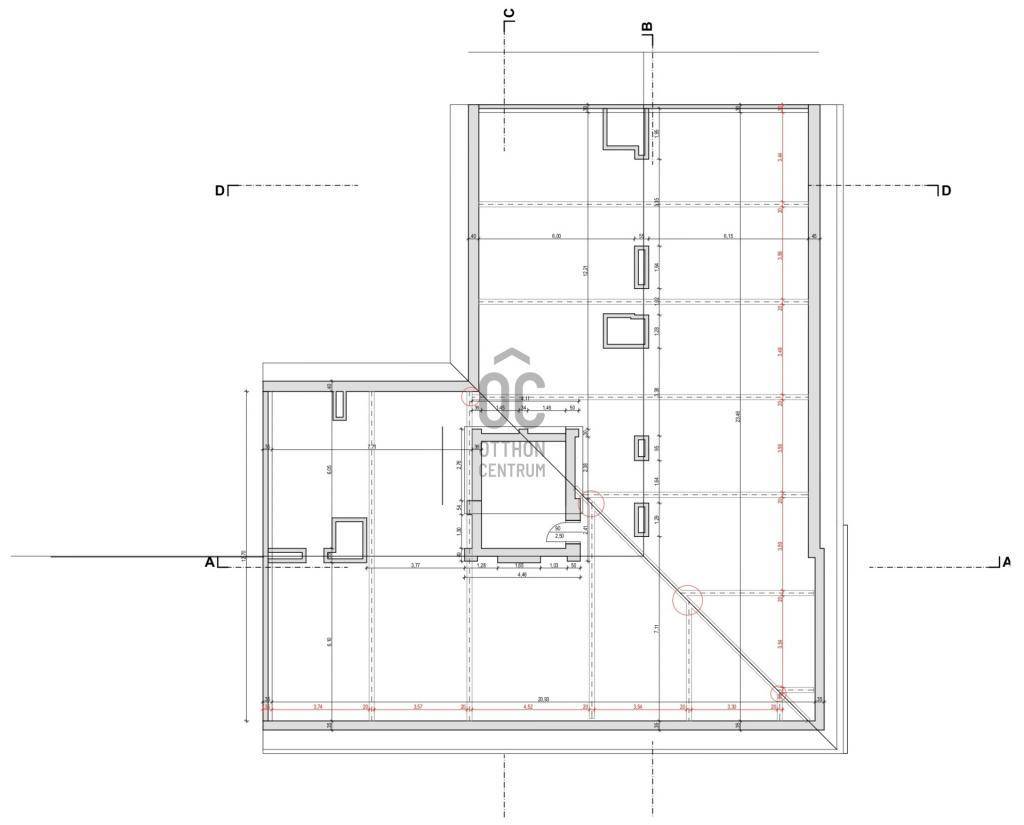 Másik épület telek területet 516m2 jelenlegi nettó alapterület 1590 m2, amire egy teljes szint és egy penthouse szint építhető.