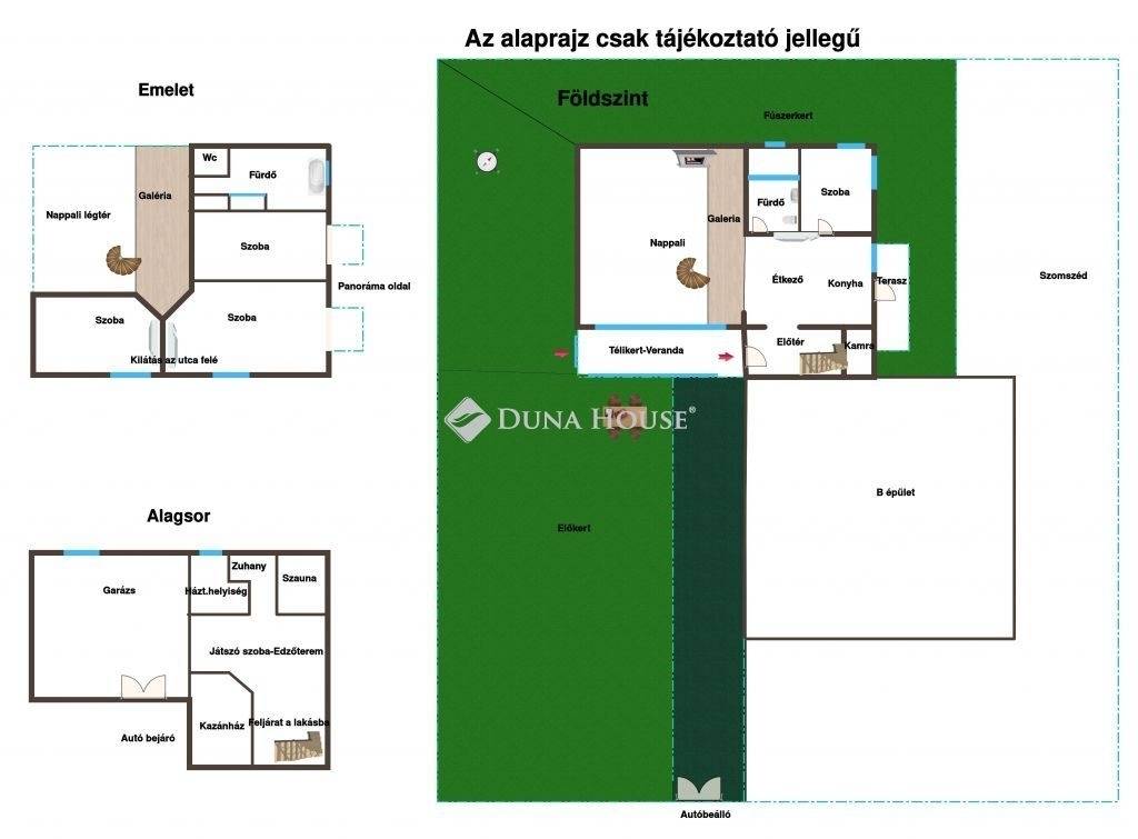 A ház különlegessége a nagy belmagasságú nappali kandallóval, és galériával, a panorámás felső szinti hálószobák, valamint az alagsori szauna a mindennapi kényelem tökéletes kombinációja.