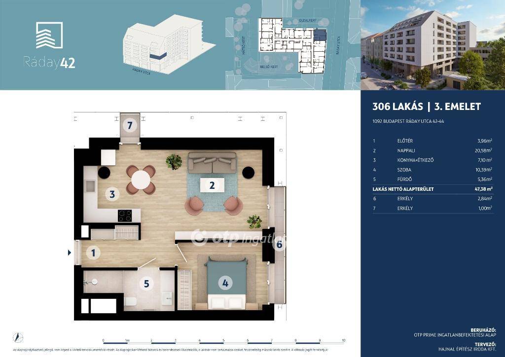 Budapest IX. kerületében, a Ráday utca 42. szám alatt kínálunk eladásra nappali + 1 szobás, 47,38 nm-es, 3,84 nm terasszal rendelkező lakást, amely egy különleges fejlesztés része. Az épület egy meglévő struktúra újragondolásával, magas műszaki tartalommal és környezettudatos megoldásokkal születik újjá.