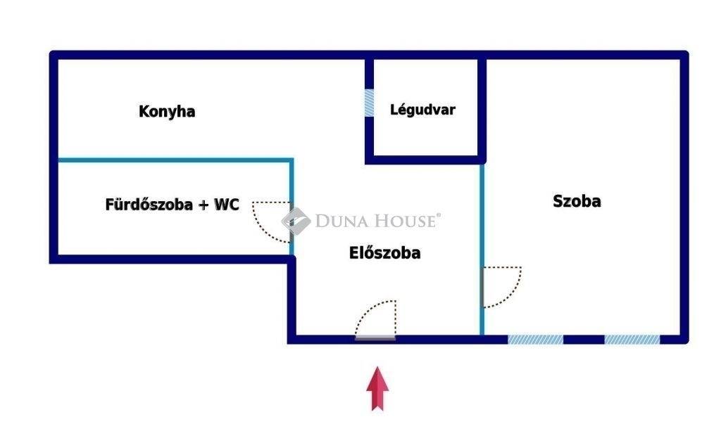 Körfolyosón keresztül jutunk el a lakáshoz, ahová belépve a konyha-étkezőben találjuk magunkat. Jobbra található a nagyszoba, balra pedig a fürdőszoba.