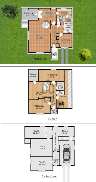 A pince szinten garázs (elektromos kapuval), valamint két további helyiség található. A kertben akár két autó fedett beállása megoldott.