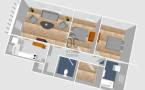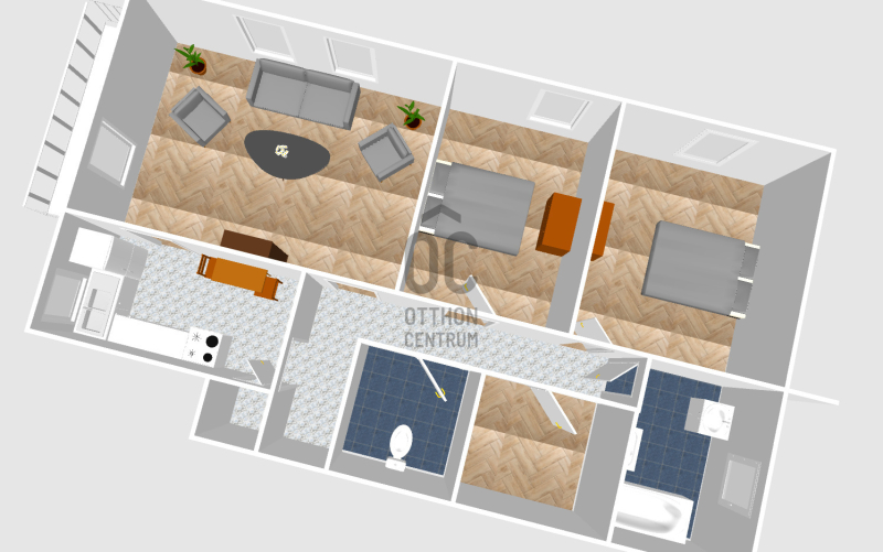 - Ideális elrendezés: 2 szoba + nappali + gardrób szoba, külön konyha, háztartási helyiség