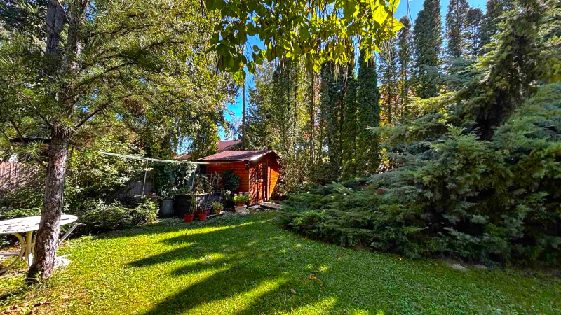 A dísznövények,örökzöldek ölelésében kerti faház, tároló található, a növények öntözése fúrt kútból megoldott .
