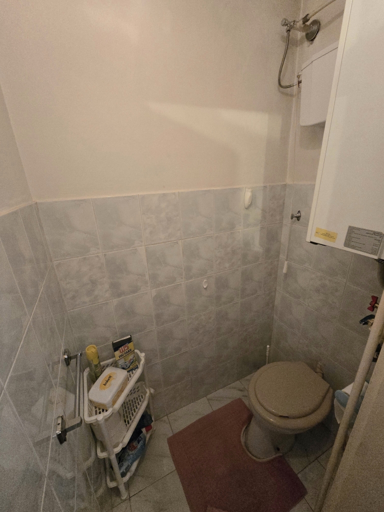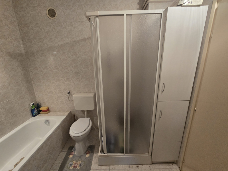- Nagy méretű fürdőszoba káddal és zuhanyzóval, ahol a WC is helyet kapott.