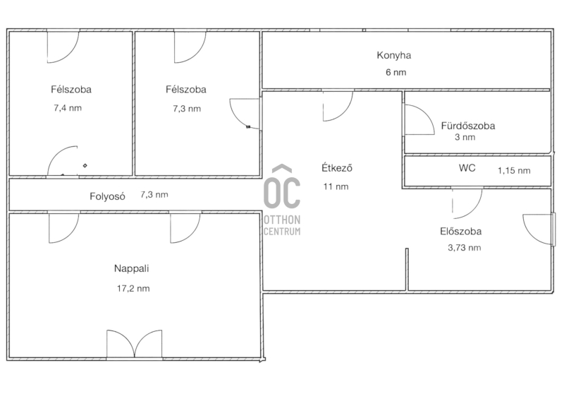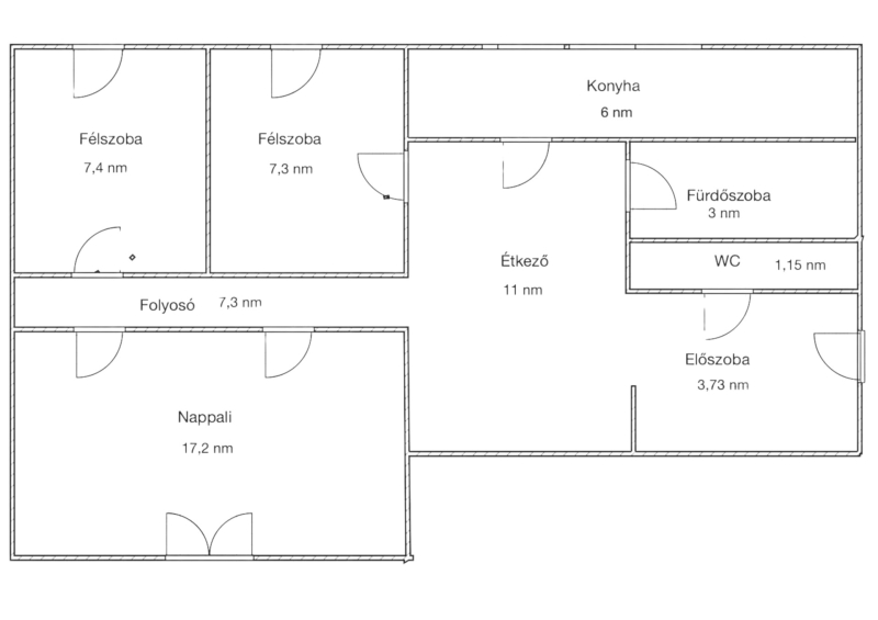 - Elrendezés: nappali/hálószoba, étkező, konyha, két félszoba, kamra, előszoba, külön fürdő és WC
