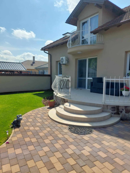 A kert rendezett, térkövezett és füvesített – azonnal birtokba vehető, gondozott környezet.