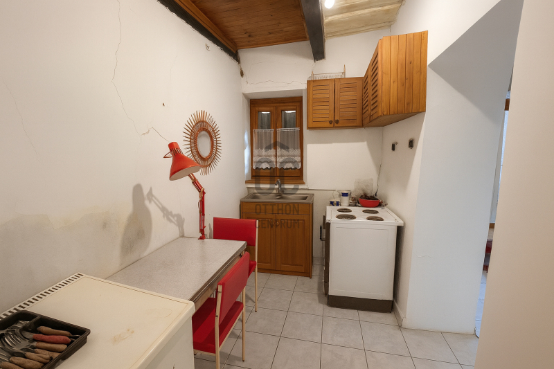 Az összesen 38 m²-es lakótér ideális lehet kis családnak, pároknak vagy hétvégi háznak. Az épület masszív kőalapra és beton alapzatra épült, falai 60 cm vastag vályogból készültek, ami természetes hőszigetelést biztosít. A cseréptetős, fa gerendás födém megőrzi a régi idők autentikus hangulatát. Az ingatlanba be van vezetve a víz, a villany és a csatorna. A gáz a telken belül található, de az épületbe nincs bekötve.