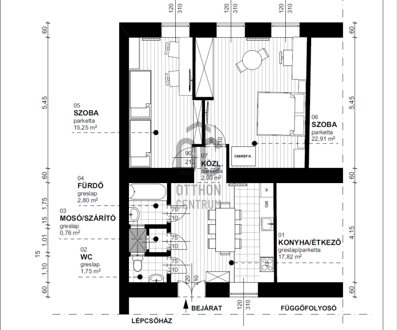 A tágas, étkező-konyháa a lakás központja lehet, amely nyugati tájolásának köszönhetően egész nap világos és barátságos hangulatú. Innen nyílik a fürdőszoba, a külön WC, valamint egy praktikus mosókonyha. A két keleti fekvésű hálószoba a csendes, rendezett utcára néz, biztosítva a nyugodt pihenést.