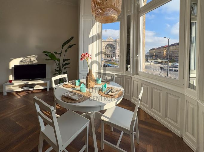 A GYÖNYÖRŰ KILÁTÁS a Keleti pályaudvar ikonikus épületére és a Baross térre az étkező 3 részes nagyméretű ablakfülkéjéből tárul fel, ELEKTROMOS REDŐNYÖKKEL.