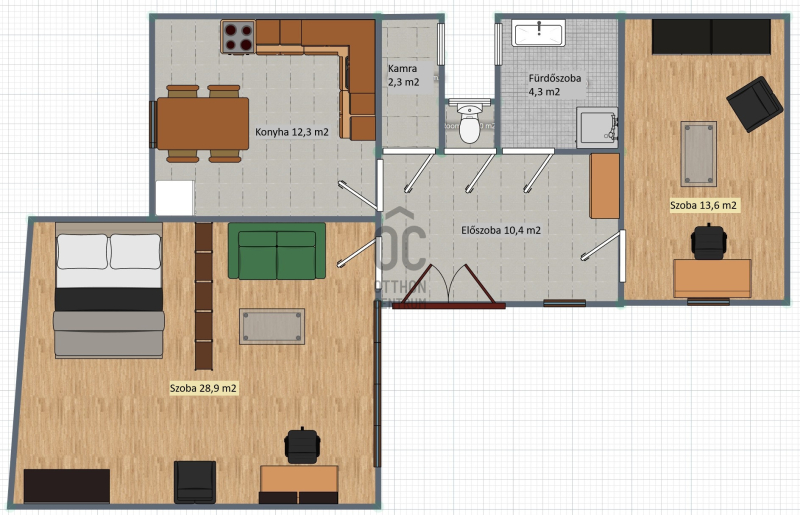 A lakás magas belmagasságának köszönhetően több helyiségben is galéria alakítható ki, ezáltal tovább növelhető a hasznos tér. Az elrendezése praktikus: külön nagy méretű konyha és kamra, külön fürdőszoba és WC, valamint tágas előtér biztosítja a kényelmes mindennapokat.