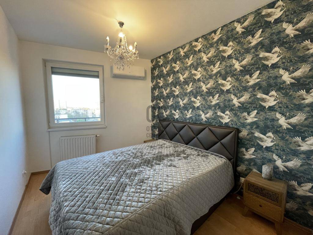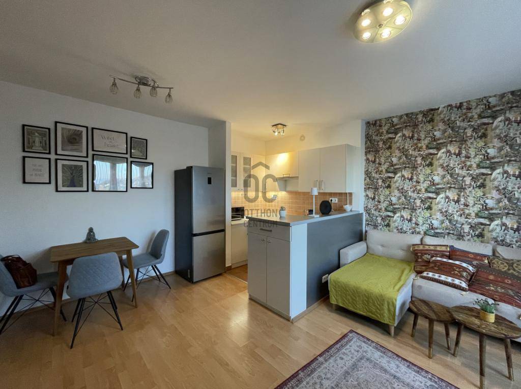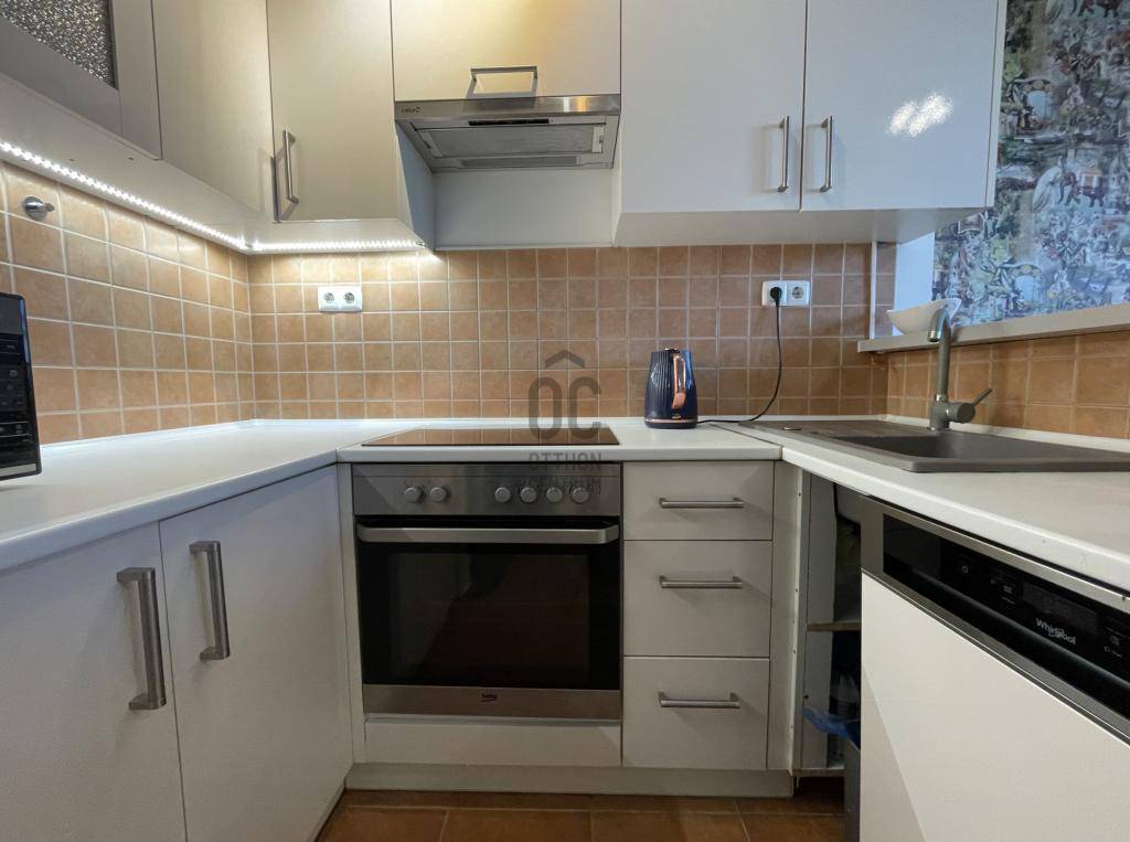 A lakás amerikai konyhás nappalija (22 m²) gépesített, beépített konyhabútorral, mosogatógéppel felszerelt. A két külön nyíló, parkettás hálószoba (10 m² és 12 m²) ideális akár gyerek-, dolgozó- vagy vendégszobának.