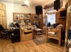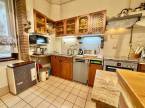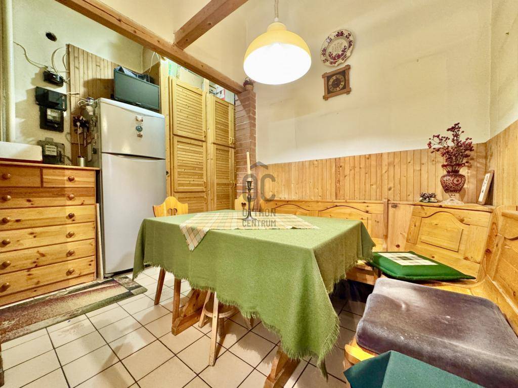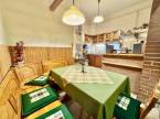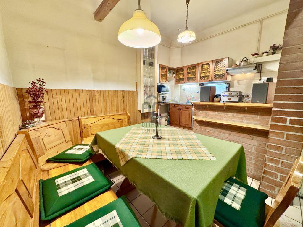 A konyha és az étkező része igazi békebeli tér. A körbeépített sarokpad, a természetes fa borítások, a falon sorakozó képek és a látszó gerenda együtt adják azt a meghitt családi hangulatot, ahol jó leülni a reggeli kávéra vagy egy hosszabb esti beszélgetésre. A kamra külön ajándék – manapság már keveseknek jut ilyen.