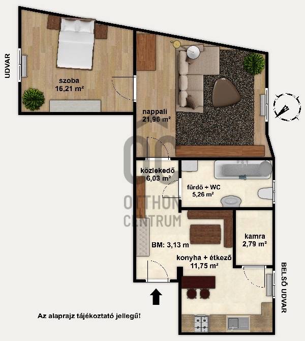 egy közel 22 m²-es nappali, mellette egy intim, udvarra néző hálószoba, tágas 12 m²-es étkezős konyha kamrával, egy szépen rendezett közlekedőtér és egy kényelmes méretű fürdő várja azt, aki szereti a funkcionális, élhető otthonokat.