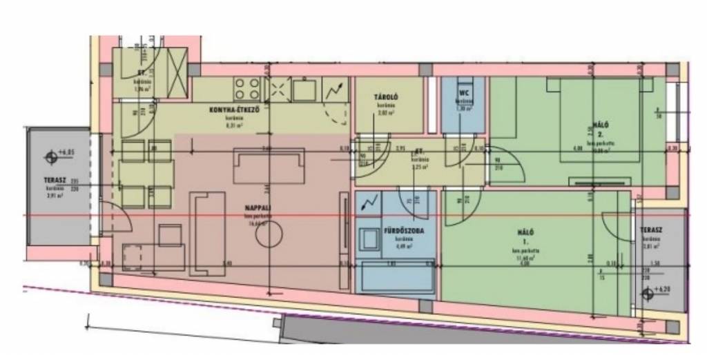 107-es lakásunk szabad a I. emeleten 59,56 m2 +6,72 m2 terasz (3,91+2,81)