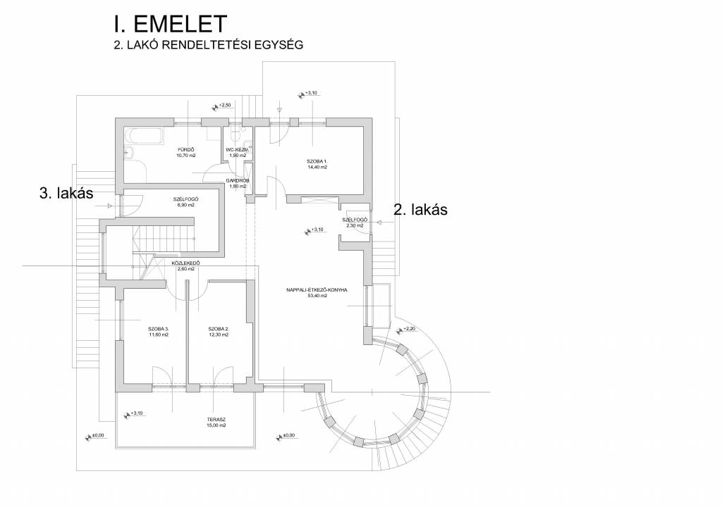 Nézzük a lakás elrendezését, egy 2,30 nm-es előszobából érkezünk az 53,40 nm-es amerikai-konyha-étkezős nappaliba, ahonnan egy 2,60 nm-es közlekedőn keresztül közelíthető meg a két hálószoba. (12,30 és 11,60 négyzetméretesek), a harmadik hálószoba egy további 2,60 nm-es közlekedőből nyílik, és 14,4 nm-es.