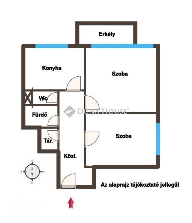 Elosztása nappali, szoba, konyha-étkező, a WC és fürdőszoba külön nyílóak. Igény esetén a konyhából egy további szoba alakítható ki.