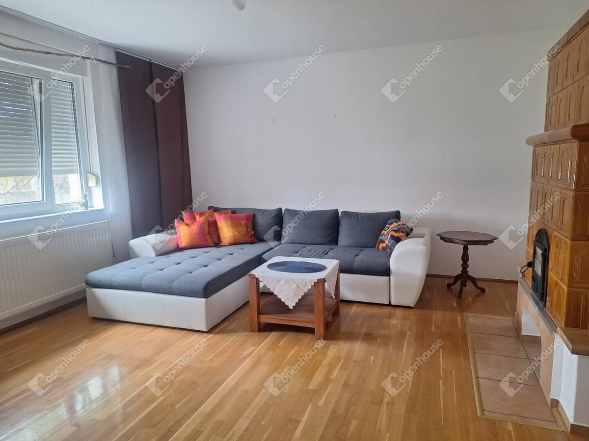 napfényes, tágas nappali épített cserépkályhával,